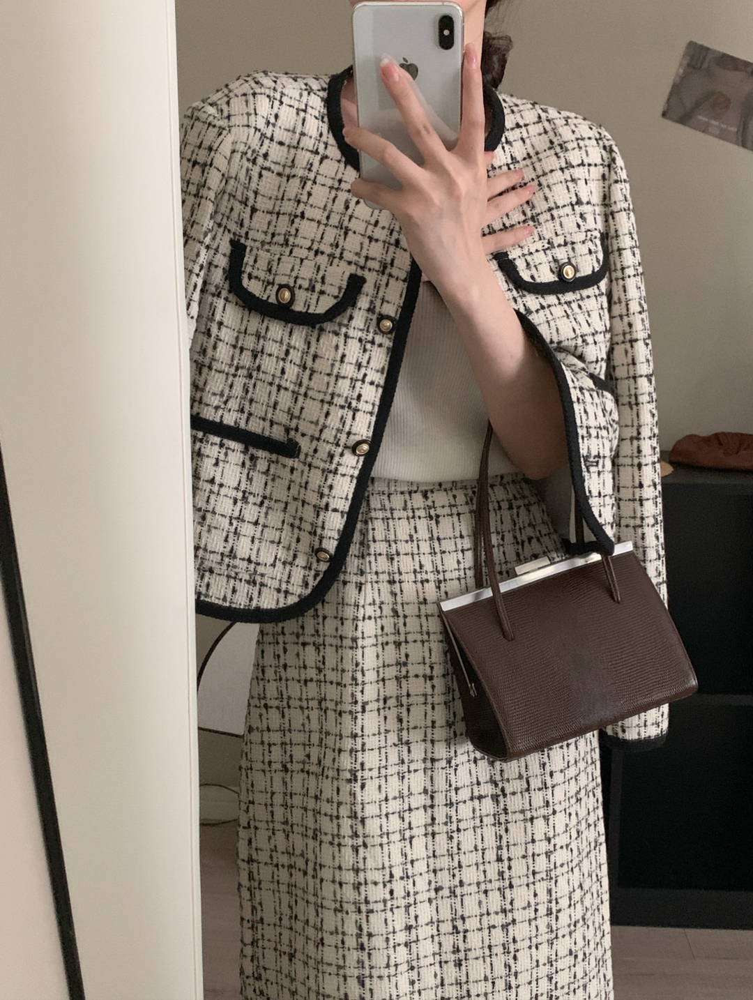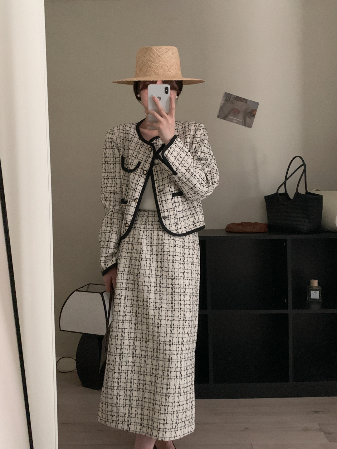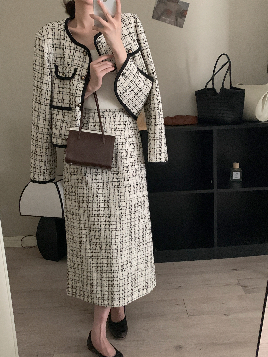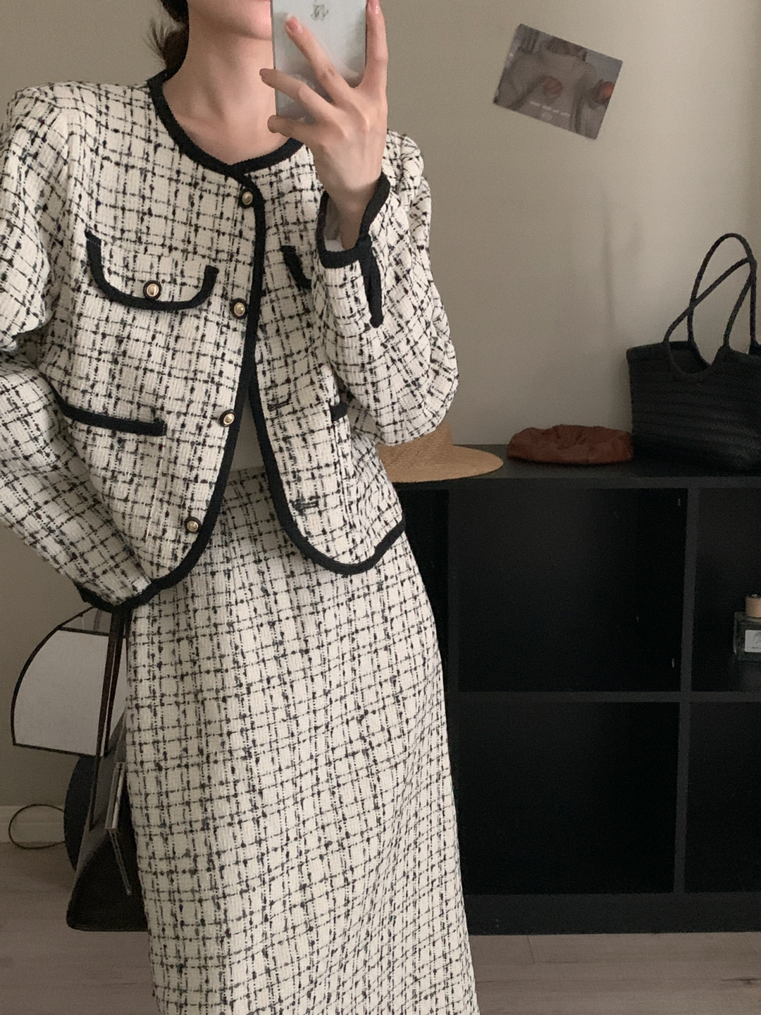 Small Country Style Round Neck Tweed Short Coat High Waist Plaid Skirt Suit