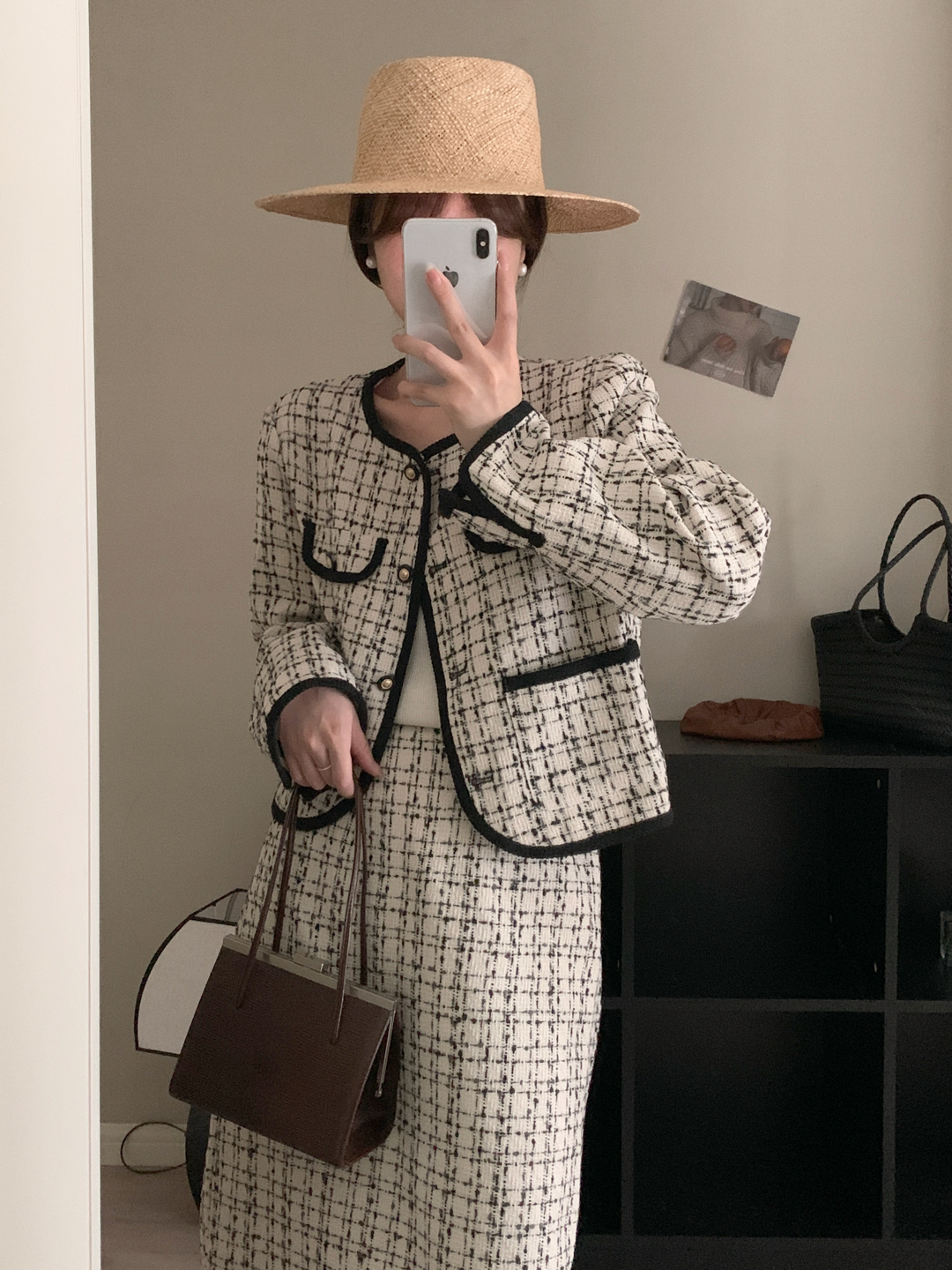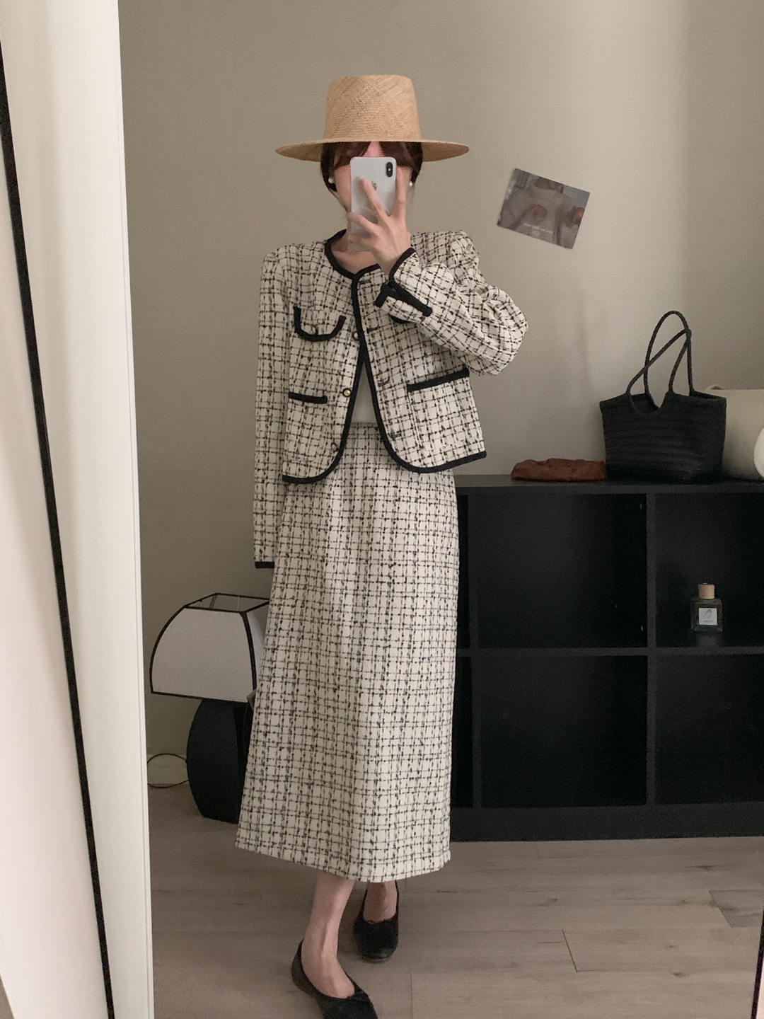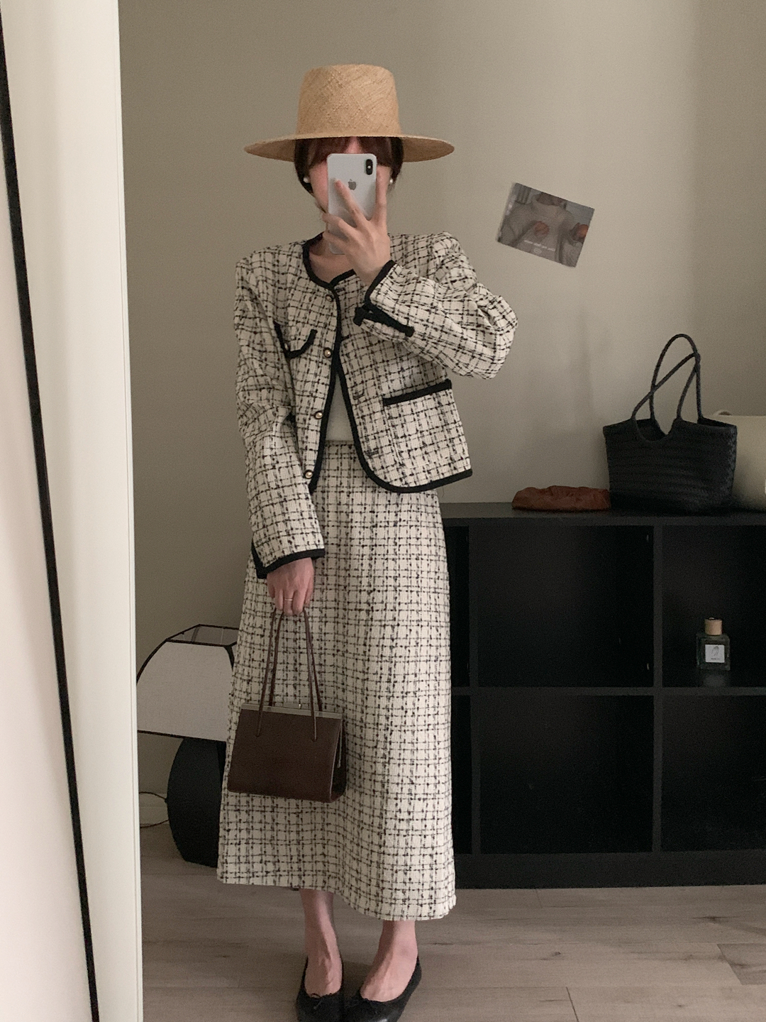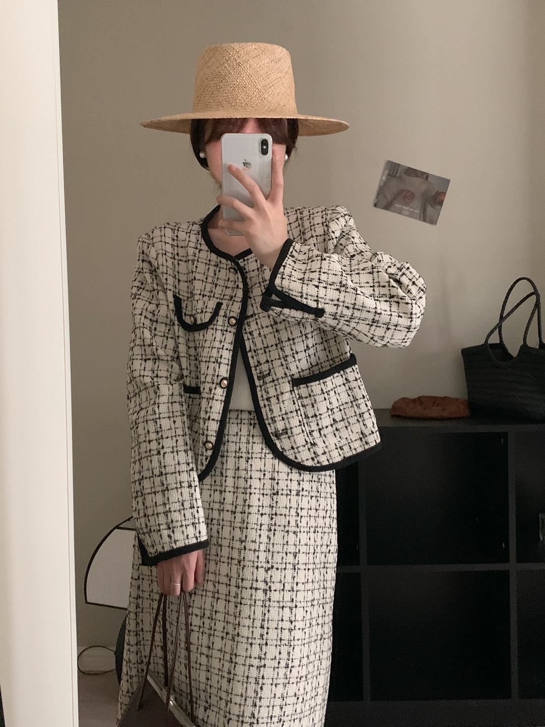 Small Country Style Round Neck Tweed Short Coat High Waist Plaid Skirt Suit